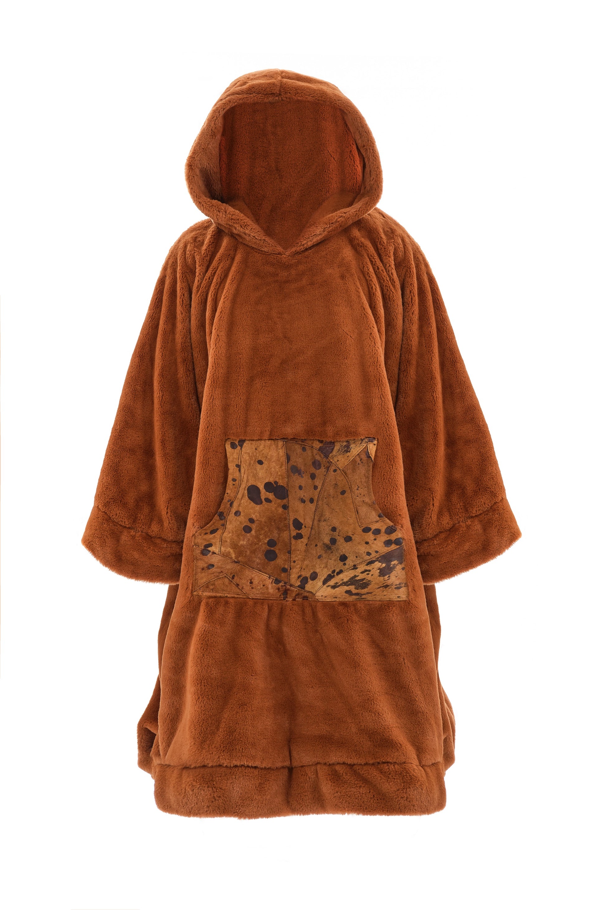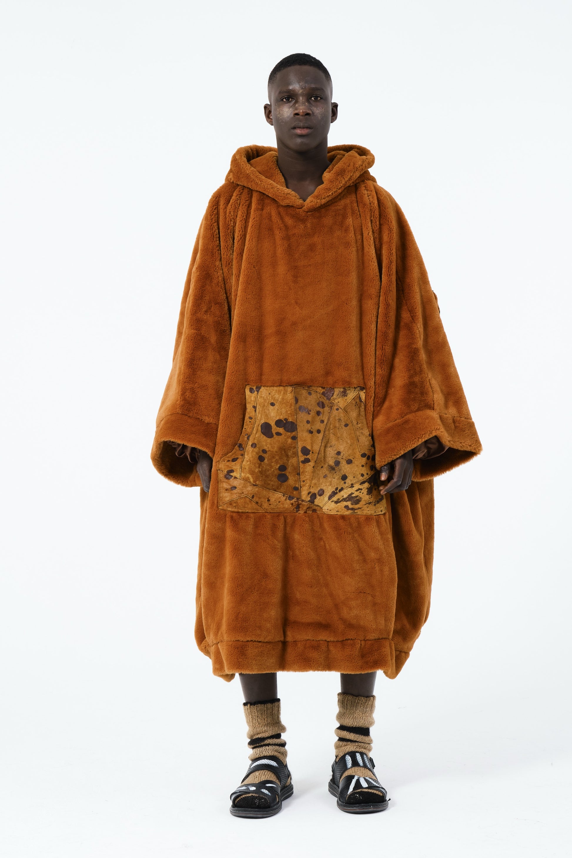 This coat showcases a striking back design inspired by the organic form of a flintstone, with sharp edges and a spotted pattern evoking its rugged texture. Crafted in a rich deep orange fabric, the design is echoed in the front pocket, creating a cohesive and bold tribute to the flintstone's subtle beauty.